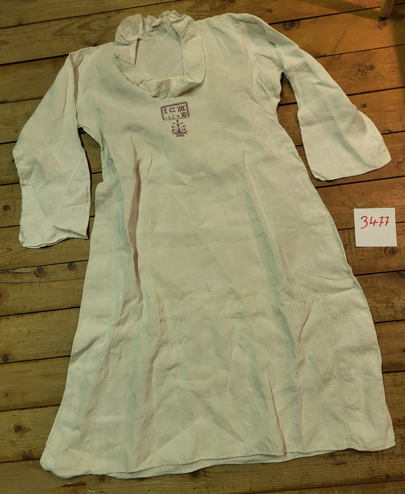 | 1 | 3477Eindeutige Nummer | NachthemdBezeichnung des Gegenstandes | normalZustand | | BekleidungBekleidung Landwirtschaft Handwerk & Industrie Handel & Gewerbe Hauswirtschaft Gesundheit Gemeinwesen Öffentliches Gut Persönliches Gut Spiel & Spielzeug Kunst & Kunstgeschichte Schriftgut Messen & wiegen Freizeit-Hobby-Sport Grabungsfunde Naturgut Waffen & Zubehör | UnterkleidungUntergruppe zur Sachgruppe | 1824Datierung des Gegenstandes | |