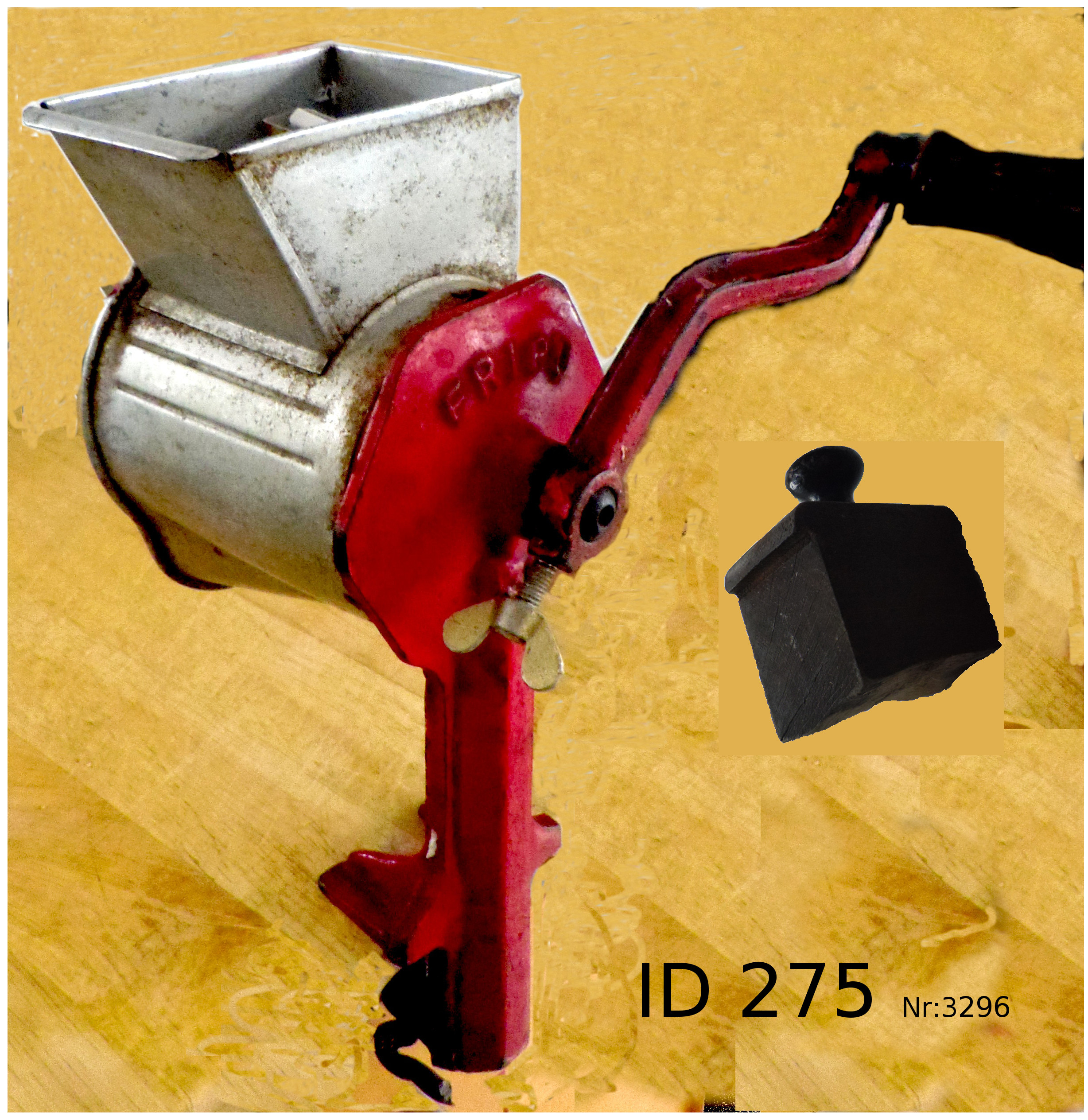 | 4 | 275Eindeutige Nummer | Kartoffelreibe Fripu 30Bezeichnung des Gegenstandes | GebrauchsspurenZustand | | HauswirtschaftBekleidung Landwirtschaft Handwerk & Industrie Handel & Gewerbe Hauswirtschaft Gesundheit Gemeinwesen Öffentliches Gut Persönliches Gut Spiel & Spielzeug Kunst & Kunstgeschichte Schriftgut Messen & wiegen Freizeit-Hobby-Sport Grabungsfunde Naturgut Waffen & Zubehör | KüchengerätUntergruppe zur Sachgruppe | 1925-1950Datierung des Gegenstandes | Fripu Werke |