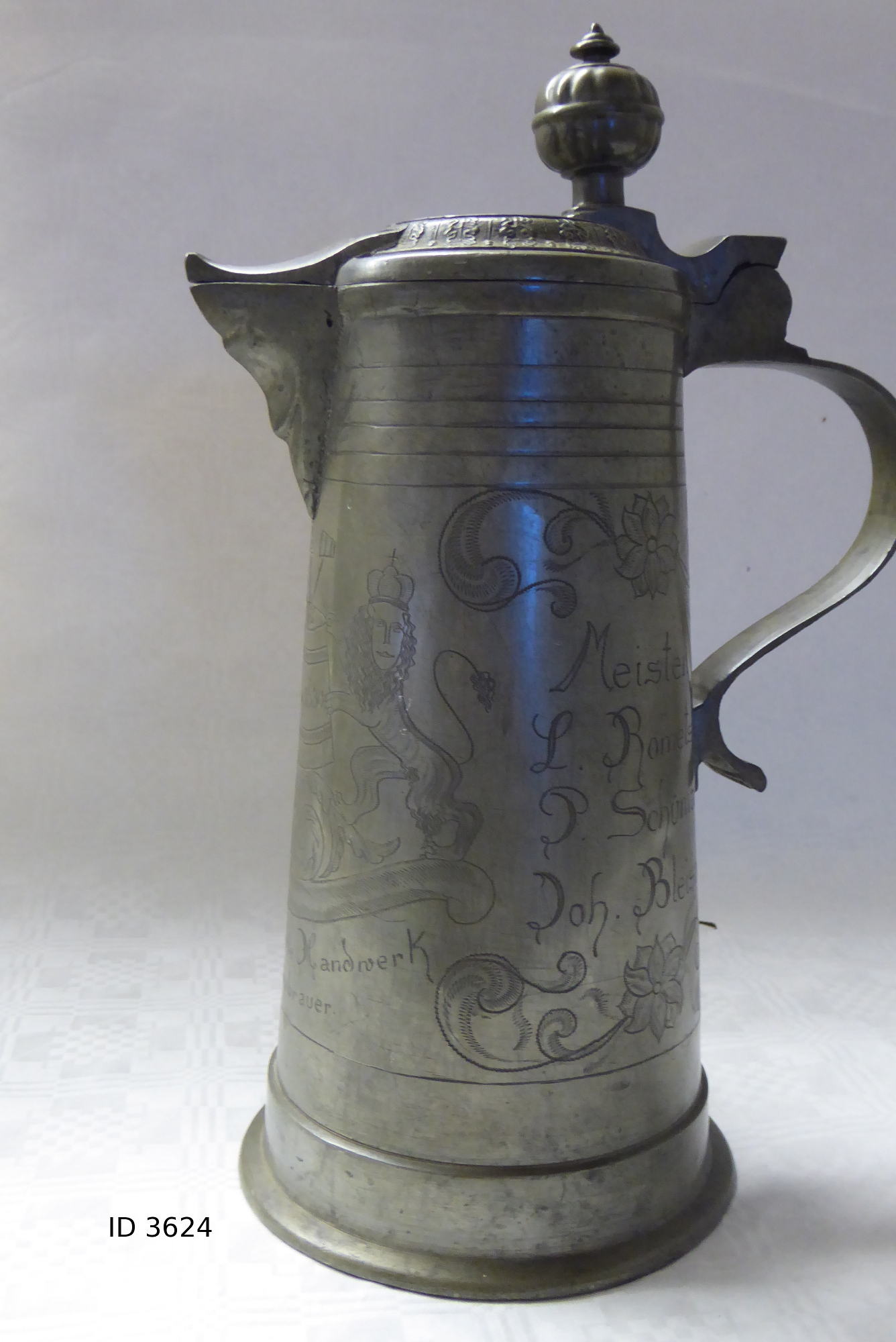| 20 | 3624Eindeutige Nummer | ZinnkrugBezeichnung des Gegenstandes | gutZustand | | Handwerk & IndustrieBekleidung Landwirtschaft Handwerk & Industrie Handel & Gewerbe Hauswirtschaft Gesundheit Gemeinwesen Öffentliches Gut Persönliches Gut Spiel & Spielzeug Kunst & Kunstgeschichte Schriftgut Messen & wiegen Freizeit-Hobby-Sport Grabungsfunde Naturgut Waffen & Zubehör | ZunftUntergruppe zur Sachgruppe | 1750-1800Datierung des Gegenstandes | 1 Foto oder Dokumente |