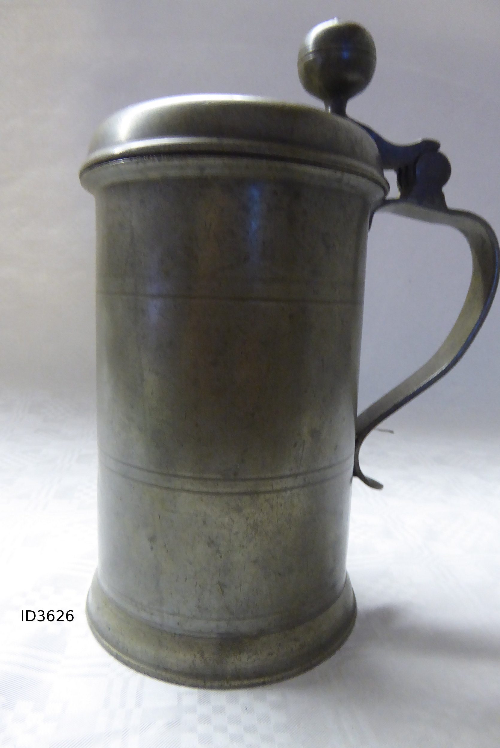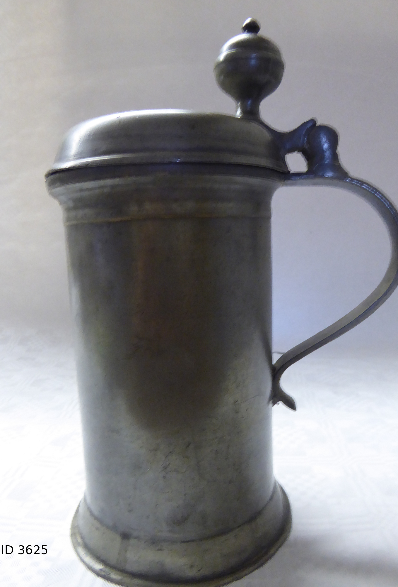 | 21 | 3625Eindeutige Nummer | ZinnkrugBezeichnung des Gegenstandes | GebrauchsspurenZustand | | HauswirtschaftBekleidung Landwirtschaft Handwerk & Industrie Handel & Gewerbe Hauswirtschaft Gesundheit Gemeinwesen Öffentliches Gut Persönliches Gut Spiel & Spielzeug Kunst & Kunstgeschichte Schriftgut Messen & wiegen Freizeit-Hobby-Sport Grabungsfunde Naturgut Waffen & Zubehör | ZinngerätUntergruppe zur Sachgruppe | 1825-1850Datierung des Gegenstandes | Zinnmarken |