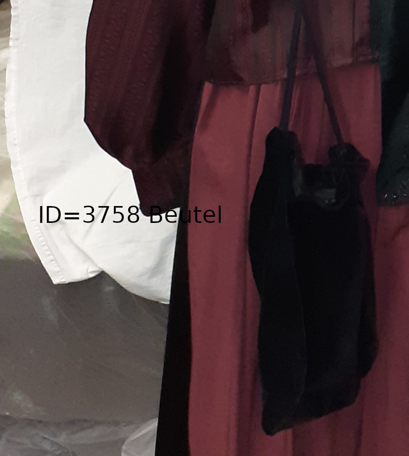 | 6 | 3870Eindeutige Nummer | Schürze WitwenkleidungBezeichnung des Gegenstandes | gutZustand | | BekleidungBekleidung Landwirtschaft Handwerk & Industrie Handel & Gewerbe Hauswirtschaft Gesundheit Gemeinwesen Öffentliches Gut Persönliches Gut Spiel & Spielzeug Kunst & Kunstgeschichte Schriftgut Messen & wiegen Freizeit-Hobby-Sport Grabungsfunde Naturgut Waffen & Zubehör | UnterkleidungUntergruppe zur Sachgruppe | 1900-1925Datierung des Gegenstandes |