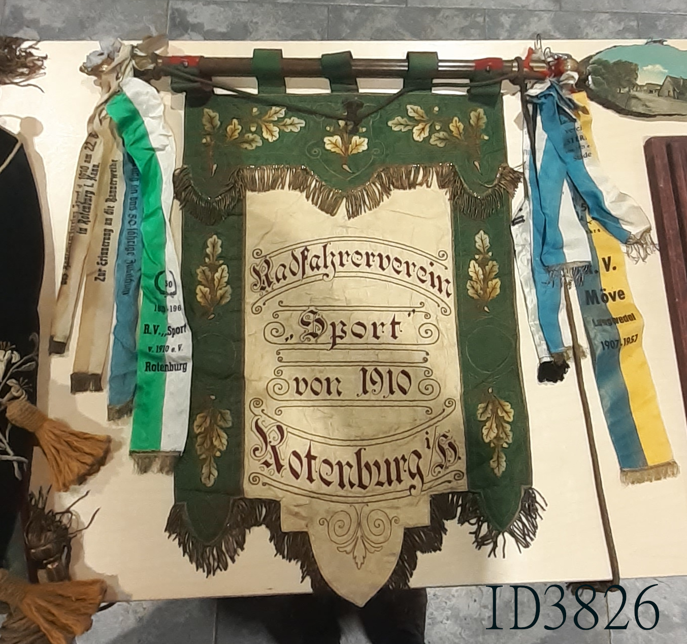 | 3 | 3826Eindeutige Nummer | Fahne RadsportBezeichnung des Gegenstandes | normalZustand | | GemeinwesenBekleidung Landwirtschaft Handwerk & Industrie Handel & Gewerbe Hauswirtschaft Gesundheit Gemeinwesen Öffentliches Gut Persönliches Gut Spiel & Spielzeug Kunst & Kunstgeschichte Schriftgut Messen & wiegen Freizeit-Hobby-Sport Grabungsfunde Naturgut Waffen & Zubehör | VereineUntergruppe zur Sachgruppe | 1925-1950Datierung des Gegenstandes | |