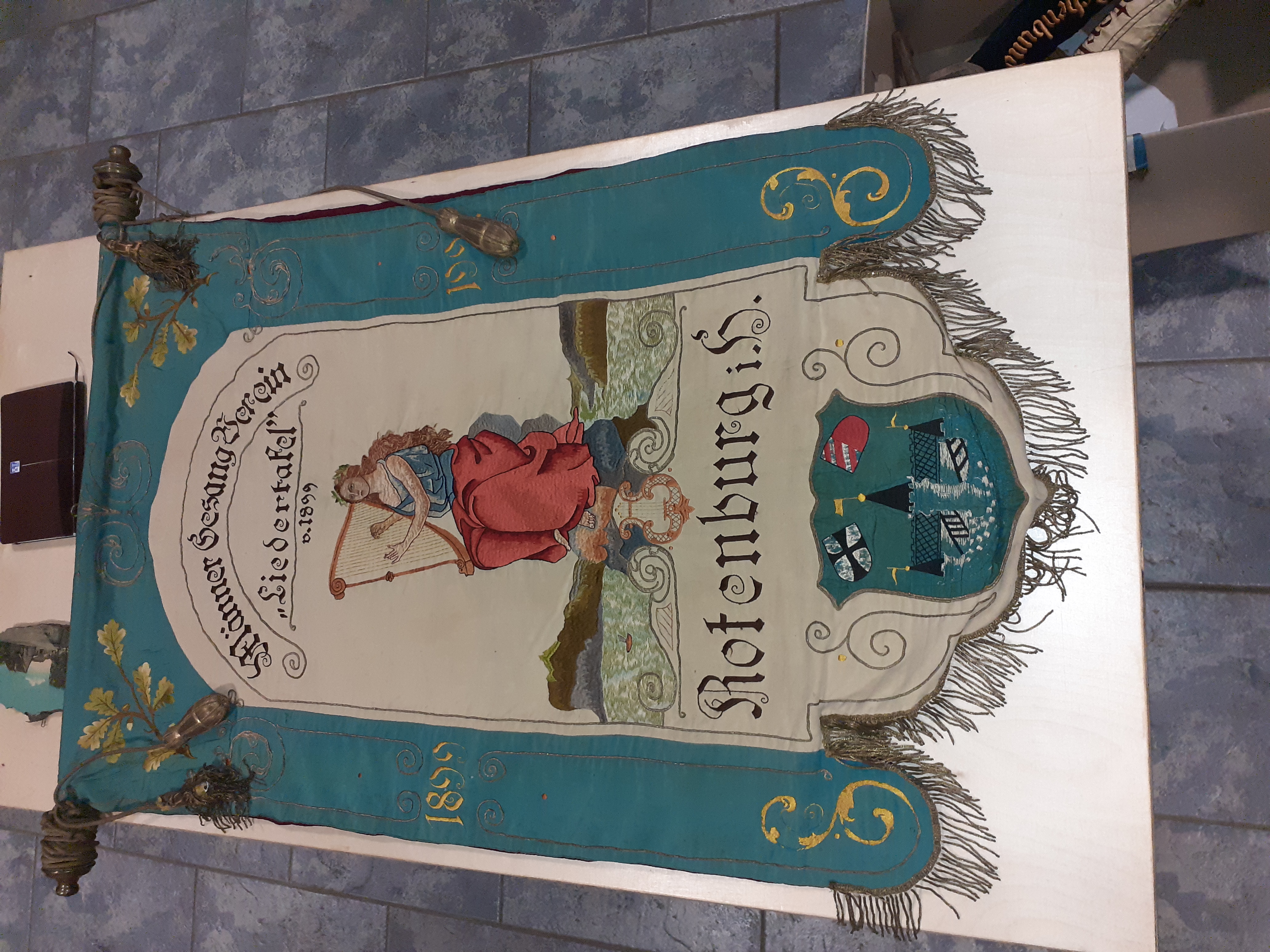 | 2 | 3722Eindeutige Nummer | Fahne MGV von 1894Bezeichnung des Gegenstandes | gutZustand | | GemeinwesenBekleidung Landwirtschaft Handwerk & Industrie Handel & Gewerbe Hauswirtschaft Gesundheit Gemeinwesen Öffentliches Gut Persönliches Gut Spiel & Spielzeug Kunst & Kunstgeschichte Schriftgut Messen & wiegen Freizeit-Hobby-Sport Grabungsfunde Naturgut Waffen & Zubehör | VereineUntergruppe zur Sachgruppe | 1925-1950Datierung des Gegenstandes | 6 Fotos 1 Bericht Fahnen |