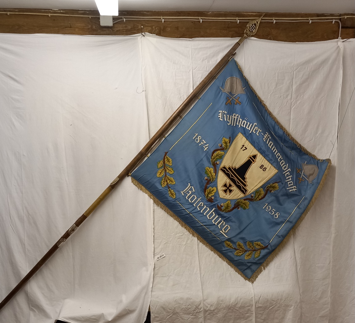 | 6 | 3871Eindeutige Nummer | Fahne Kyffhäuser Bund RotenburgBezeichnung des Gegenstandes | gutZustand | | GemeinwesenBekleidung Landwirtschaft Handwerk & Industrie Handel & Gewerbe Hauswirtschaft Gesundheit Gemeinwesen Öffentliches Gut Persönliches Gut Spiel & Spielzeug Kunst & Kunstgeschichte Schriftgut Messen & wiegen Freizeit-Hobby-Sport Grabungsfunde Naturgut Waffen & Zubehör | VereineUntergruppe zur Sachgruppe | 1875-1900Datierung des Gegenstandes | Wiki |